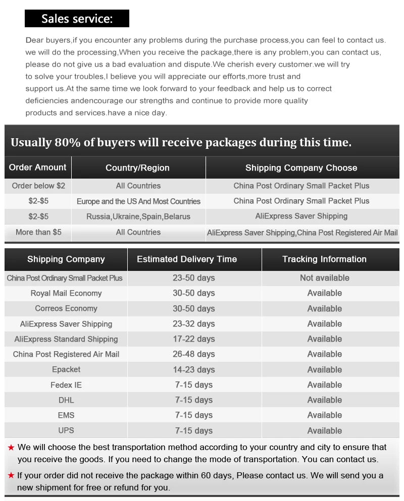 1.we need 1-2 days to prepare the order after payment. 2.Please double check your address before completing the payment. Russian buyer please leave us your full name.