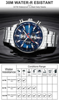Feature: Auto Date,Chronograph,Complete Calendar,Water Resistant,luminous hands