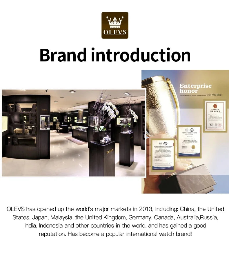 OLEVS has opened up the world's major markets in 2013, including: China, the United States, Japan, Malaysia, the United Kingdom, Germany, Canada, Australia,Russia,India, Indonesia and other countries in the world, and has gained a good reputation. Has become a popular international watch brand!