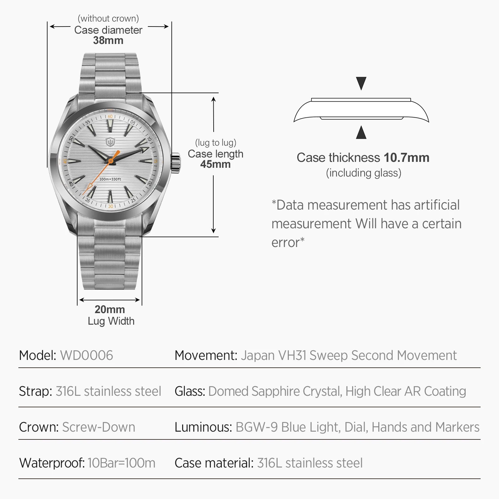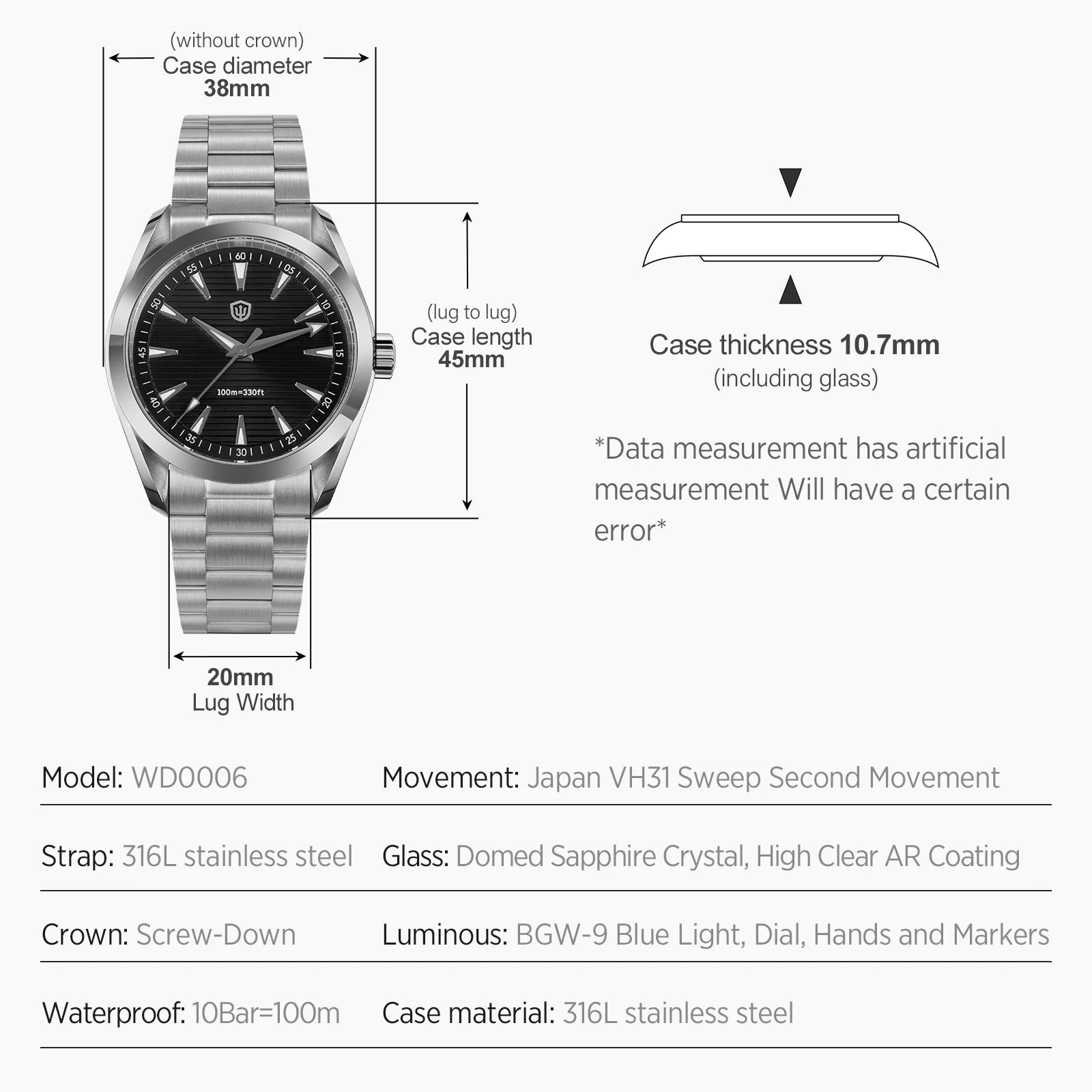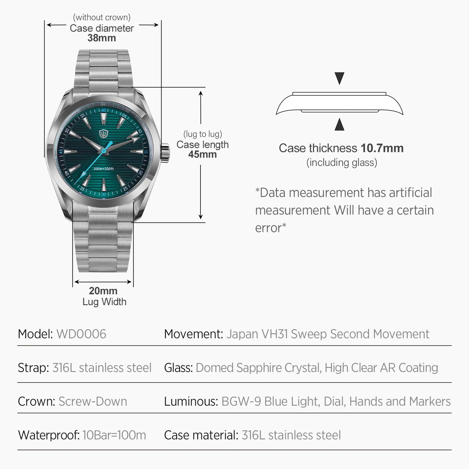 Watchdives WD0006 Watch VH31 Sweep Second Movement Domed Sapphire Crystal BGW9 Luminous 10Bar Waterproof 38mm Vintage Watches